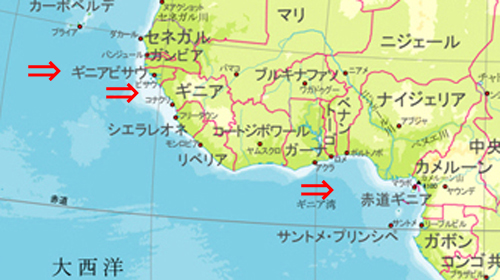 ギニア、ギニアビサウ、赤道ギニアの3か国は西アフリカのギニア地域に位置することから、共通して「ギニア」という名称を持っています。